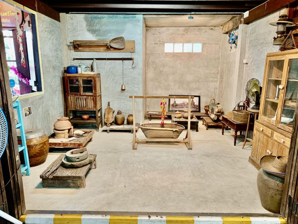 - มุมตกแต่งด้วยจักรเย็บผ้าเก่า, โอ่งน้ำ, ข้าวของโบราณ